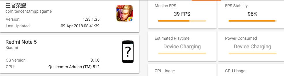 当然,骁龙 636 的实际性能如何,还是要通过游戏来测试。首先,我们试了下王者荣耀,开启高帧率、特效全部调到最高后,红米 Note 5 的平均帧率为 39 帧。