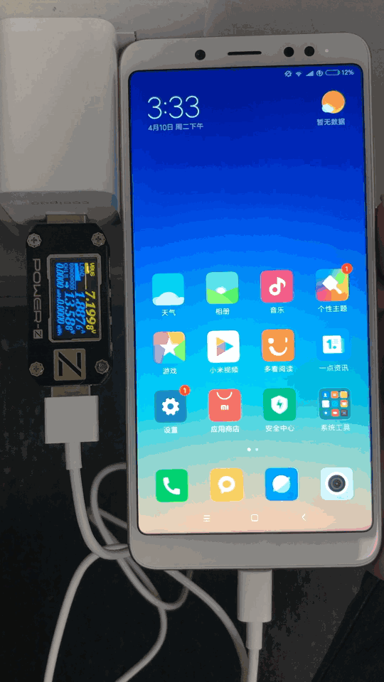 此次官方明确表示红米 Note 5 支持 QC 3.0 快充,但可能是出于成本的考虑,只配备了一个 10W 的充电头。我们使用了一款支持 QC 3.0 的第三方充电头和这款手机自带的 Micro USB 数据线进行了充电测试,充电过程中的峰值功率可以接近 14W。
