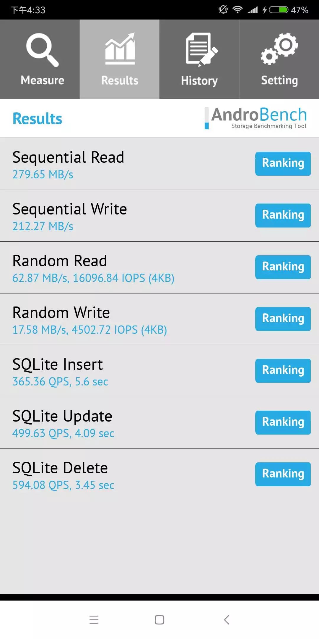 红米 Note 5 的闪存规格为 eMMC 5.1,不过让人比较惊喜的是,它的顺序读写和随机读写速度都比较让人满意。