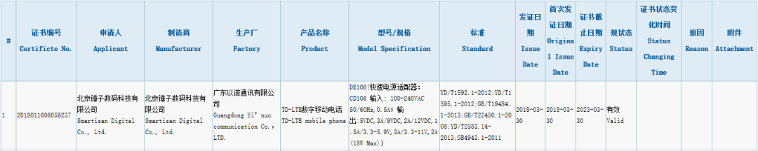 同时,锤子科技一台型号为 DE106 的新机在 4 月 10 日通过了国家 3C 认证,根据认证资料我们可以知道,新机将会支持 18W 的快充。在这个时候通过认证,这有没有可能这手机就是即将要发布的锤子 R-1 呢?