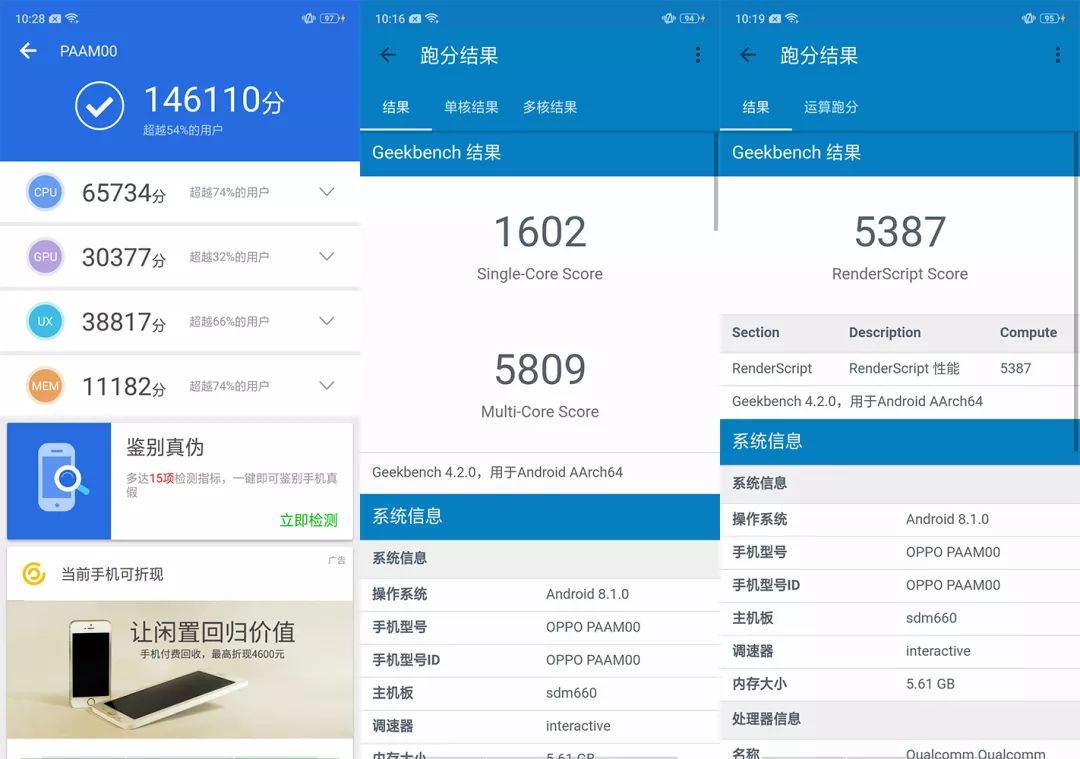 搭载高通骁龙 660 平台的 R15 梦镜版跑分成绩为安兔兔 146110 分,GeekBench 4.2 的单核分数为 1602,多核分数为 5809,运算分数为 5387 分。