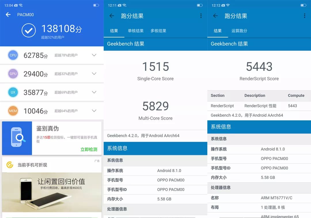 我们首先用多个跑分软件来测试处理器平台的理论性能,跑分结果显示,OPPO R15 的安兔兔成绩为 138108 分,GeekBench 4.2 跑分单核成绩为 1515 分,多核成绩为 5829 分,运算跑分 5443 分。