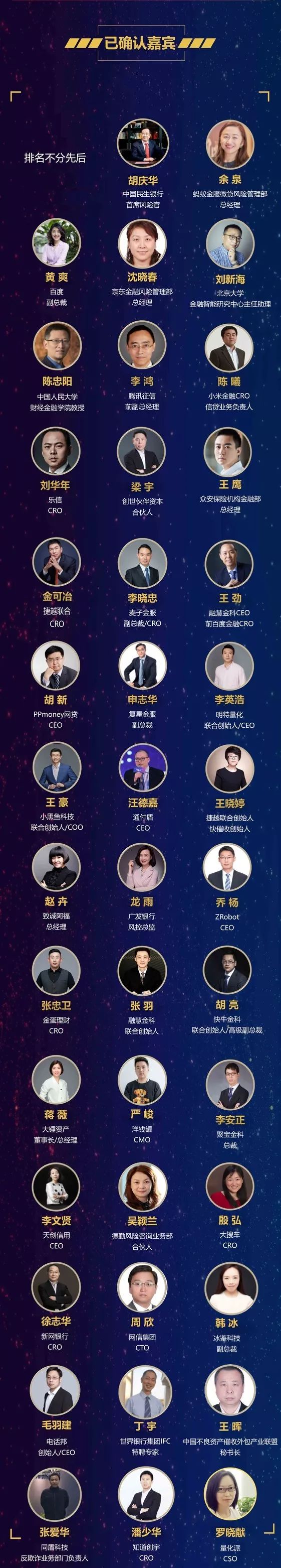 届时,蚂蚁金服微贷风险管理部总经理余泉、百度副总裁黄爽、腾讯征信前副总经理李鸿、京东金融风险管理部总经理沈晓春等几十位金融界大咖都将出席会议。