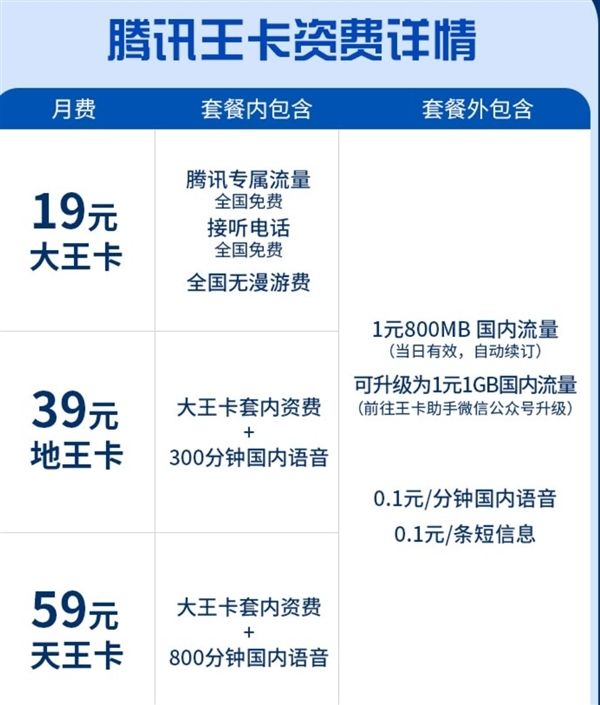 目前,大王卡月费19元,地王卡月费39元,天王卡月费59元。