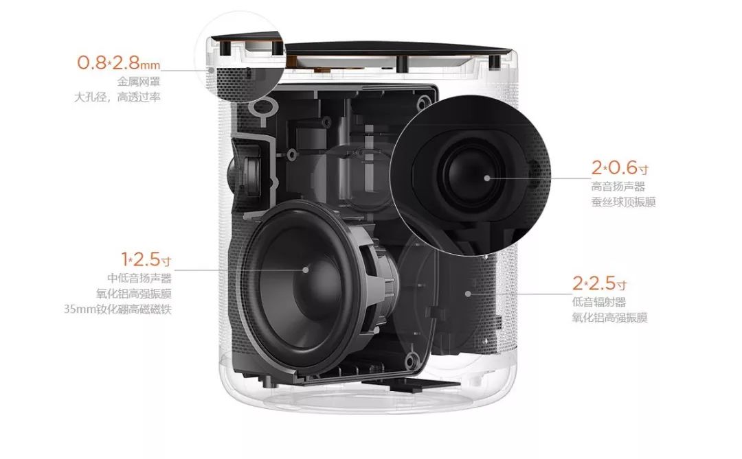 而眼前这台小豹 AI 音箱,两个 0.6 寸的高音扬声器,一个 2.5 寸的重低音扬声器,还有两个 2.5 寸的低音辐射器,从配置上来看和 Sonos One 不相上下。