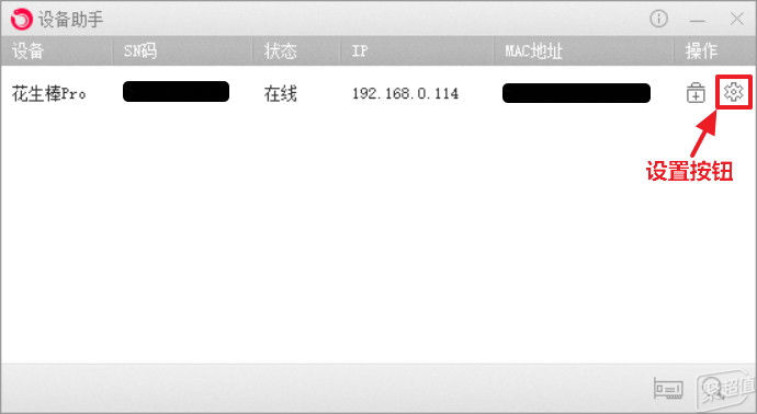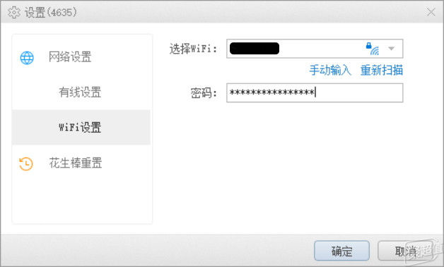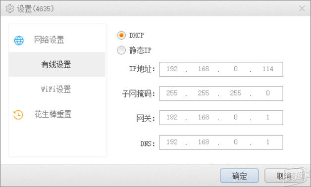 将花生棒Pro的电源以及网线连接好之后,在电脑上打开花生棒助手,就可以自动搜索到局域网中的花生棒Pro。点击设置按钮,可以指定花生棒Pro的IP地址分配方式,以及WIFI设置。