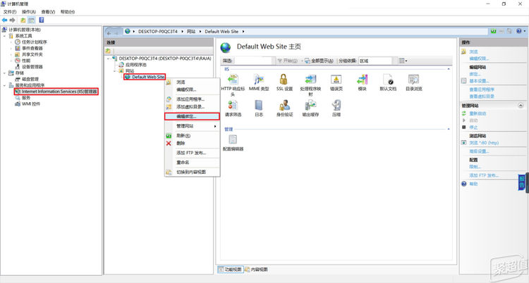 在打开的“计算机管理”页面,选择“Internet Information Services(IIS)管理器”,然后右键单击中间列表下的“Default Web Site”,选择“编辑绑定”。