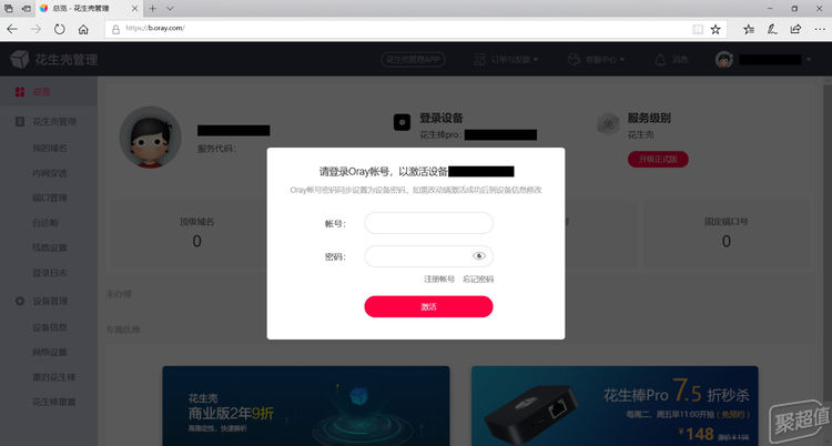 初次登录管理平台的时候,必须将花生棒Pro与已有 Oray 账号绑定才能激活使用,如果没有 Oray 账号的话,需要注册一个,并且进行实名认证。