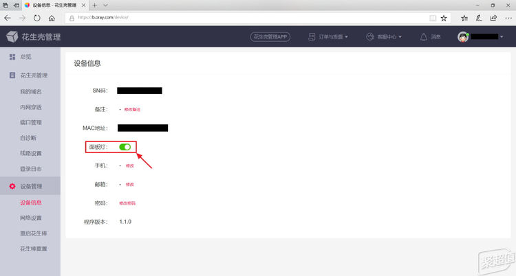 首先点击左侧导航的“设备信息”选项,对花生棒的固件进行升级,升级到1.1.0版本之后,可以关闭花生棒Pro面板上的灯光效果,减少光污染。