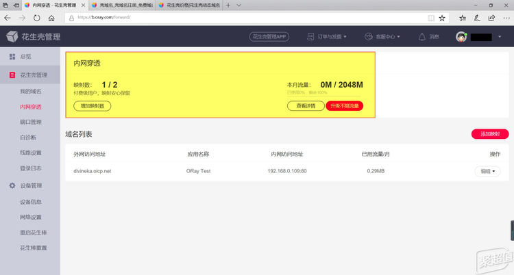 登录管理页面,选择左侧导航的“内网穿透”,然后在右侧界面点击“添加映射”按钮。