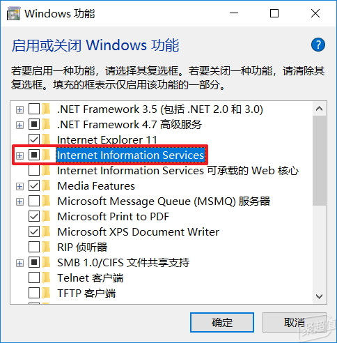 在“Windows 功能”对话框,找到“Internet Information Services”,选中前面的空白方格,然后点击确定,这时发布网站所需要的IIS环境就添加好了。