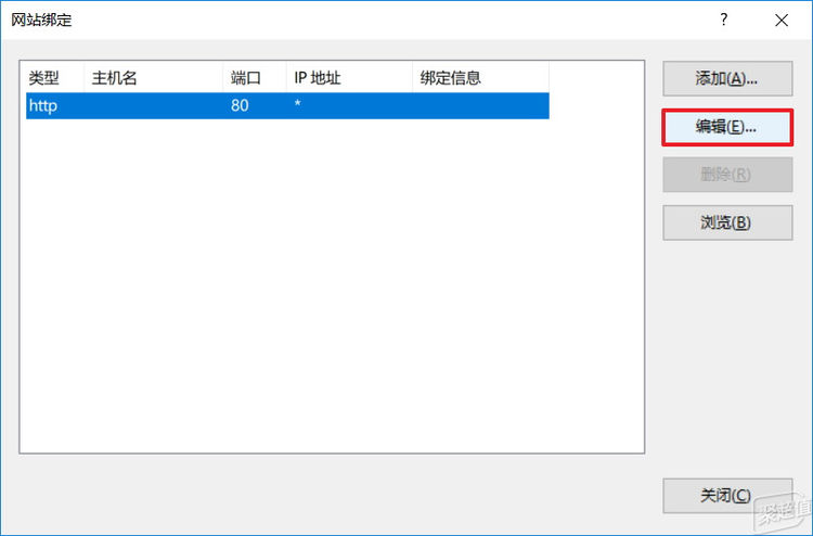 在打开的“网站绑定”页面,可以看到默认网站的访问端口是80,点击右侧的“编辑”按钮,可以更改成其它端口,这里我们就用默认的80端口。