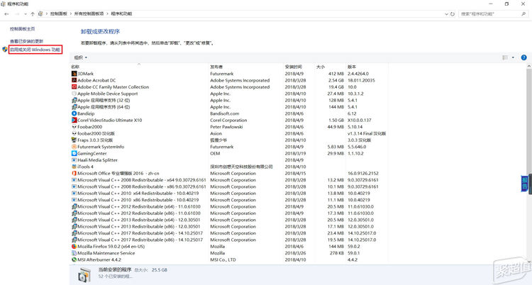 在“程序和功能”页面,点击左侧导航栏的“启用或关闭 Windows 功能”。