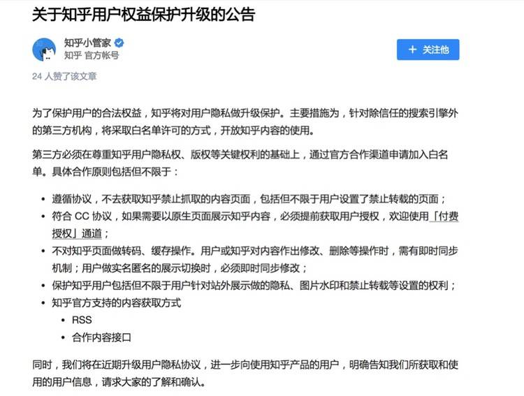 据了解,第三方可以在尊重用户隐私权、版权等关键权利的基础上,通过官方合作渠道申请加入白名单。知乎所公布的合作原则包括:不获取知乎禁止抓取的内容页面,包括但不限于用户设置了禁止转载的页面;不对知乎页面做转码、缓存操作等。不被违规抓取,意味着用户的隐私权、著作权将得到更好的保护。而拒绝违规转载,选择被转载的方式,也一向被视为用户天然的权利。