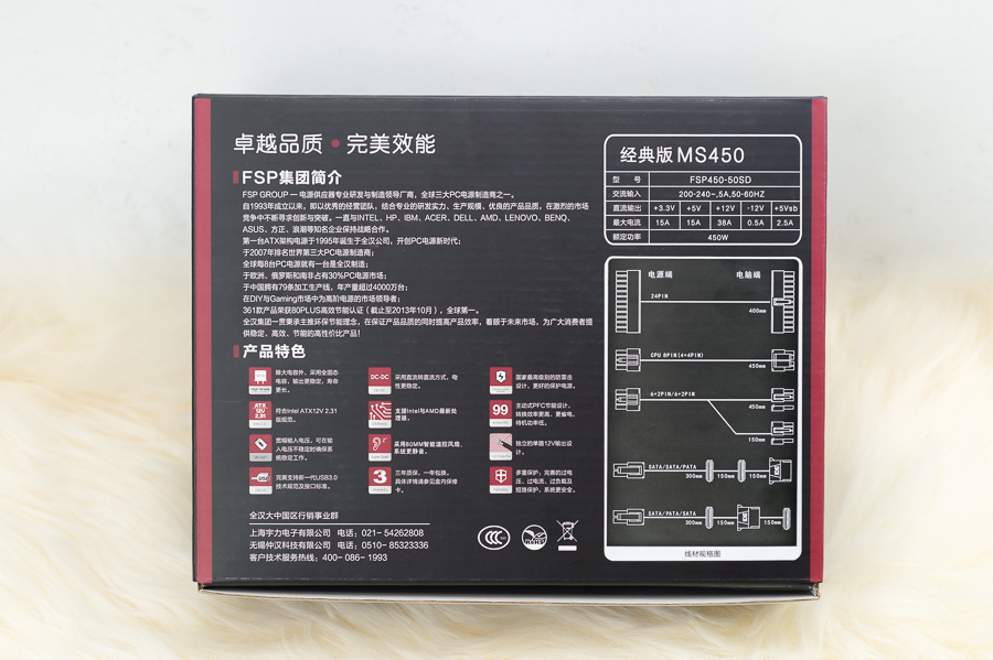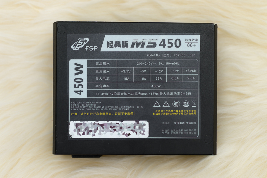 电源参数为额定功率450瓦,80PLUS铜牌,50%负载转换效率88%,单路12V 最大输出电流 38A,456瓦。