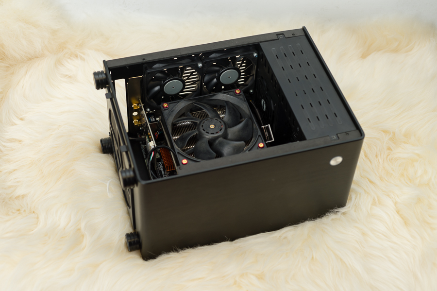 机箱内的功能性部件全部安装完毕,可以看到因为原装模组线的长度非常合适,所以机箱内看不到乱七八糟电源线。
