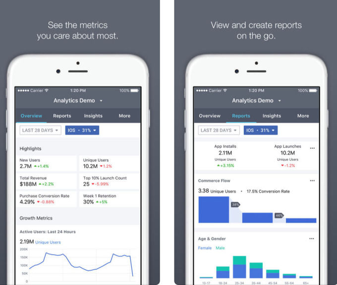 FacebookAnalytics应用允许用户创建定制的移动视图,以便其获悉营收、存留、统计、活跃用户等重要指标,且与Facebook的网络分析套件紧密联系。