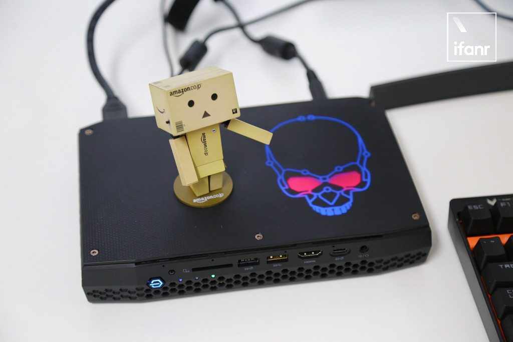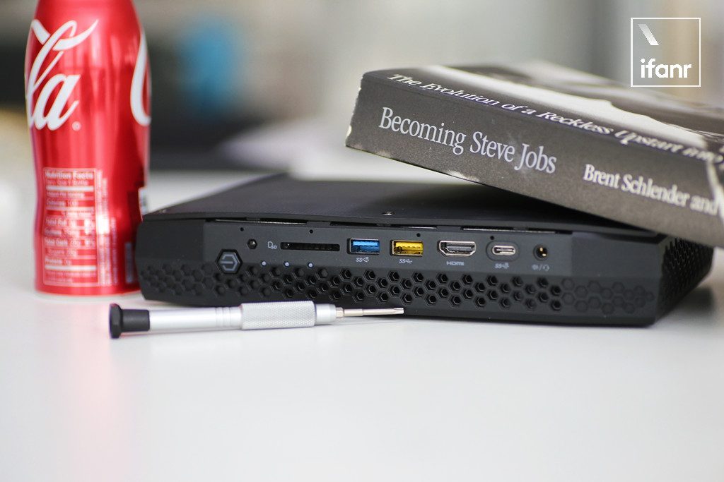 新骷髅峡谷正反两面恨不得塞满全部空间的插口,是我要给这台设备高分的理由。在设计面对用户的一侧,安置了电源键、红外接收器、SD 读卡器、一个 USB 3.1 Gen2、一个 USB 3.0、一个 HDMI 2.0 接口、一个 USB Type-C、一个耳机/麦克风二合一接口。