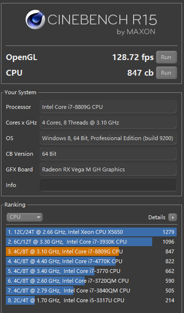 在 Cinebench 的复杂运算场景下,8809G 的 847cb 的分数约为 8700K 1449cb 分数的 60%。
