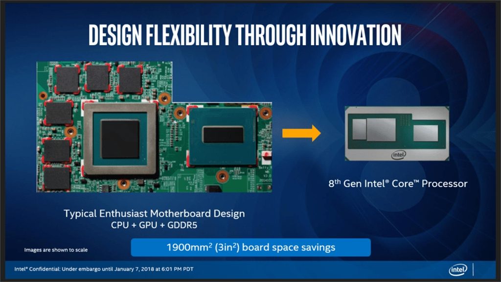 Intel 将酷睿 CPU、AMG Vega 显示芯片和 4GB 的显存封装在了一起,相对传统的 CPU+GPU 单独配置的方式,Intel 的这一方案拥有三方面的进步: