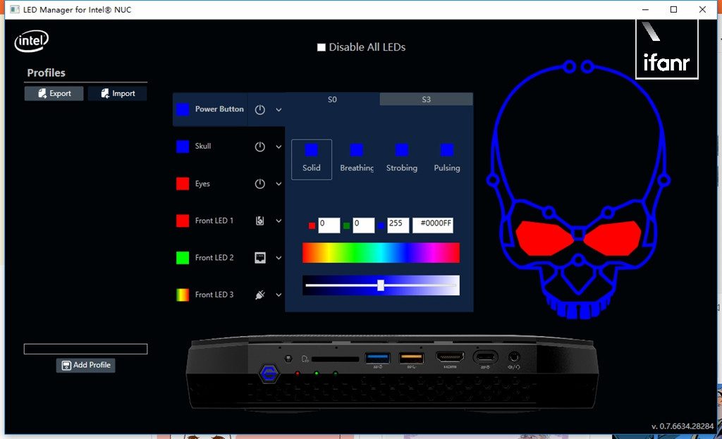 刚开机就发现一个小彩蛋,通过 Intel 预装的驱动程序,骷髅 Logo 各个部位的颜色都可以自己定义。