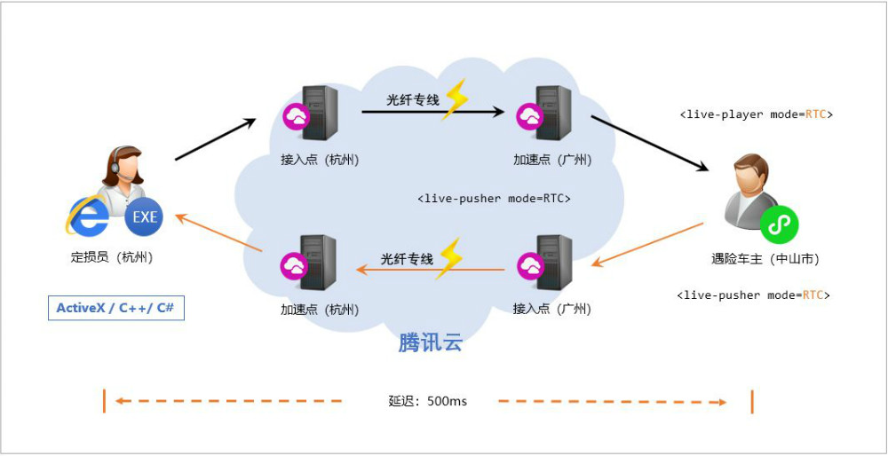 比如在车险定损的场景里,遇险的车主通过小程序呼叫保险公司,这个时候保险公司内部的定损客服只要通过一路低延时的链路就可以看到车子的出险情况。但是仅仅这样还不够,视频内容跟图片一样,都容易被实现伪造和作假。所以定损员就需要有一路视频同样到达车主那里,这样两路音视频同时连通,就构成了一个典型的视频通话场景。由于车主和定损员可以通过视频进行交流,因此造假骗保的风险就被极大地降低了。
