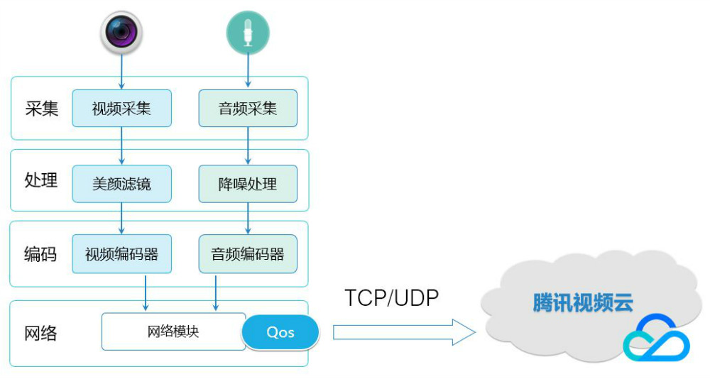 就是把自己手机上的声音和画面实时的上传到云端。我们将这部分能力用视频云 SDK 进行实现,并封装成一个叫做 的标签。