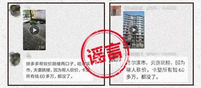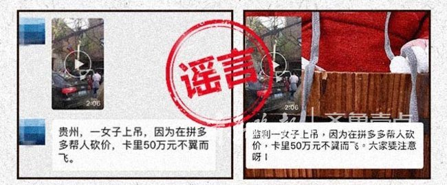 拼多多方面表示,这条1年前的视频,被别有用心者配以“拼多多砍价”等文字,捏造出湖北、贵州等地女子因砍价被骗轻生的谣言,引发了消费者恐慌。