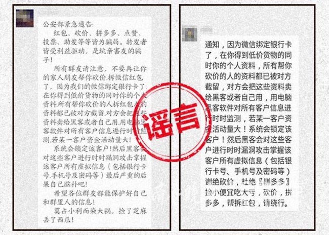 4月5日,河南平顶山警方对发布“公安部紧急通告:红包、砍价、拼多多皆为骗局”谣言的网民陈某,依法做出行政拘留三日的处罚。此外,放任他人传播谣言的微信群主王某,也因违反《互联网群组信息服务管理规定》,被警方批评教育。
