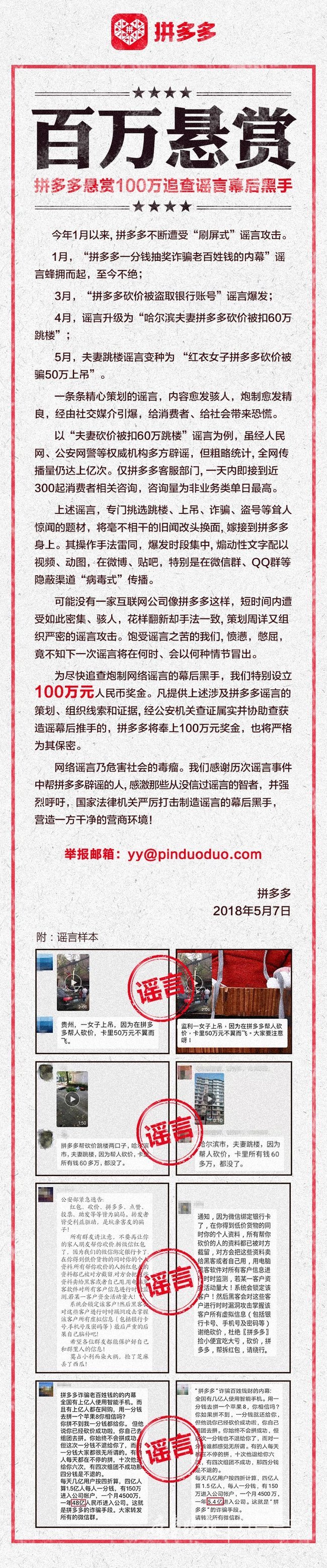 原标题:网络谣言四起,拼多多悬赏100万追查制谣黑手