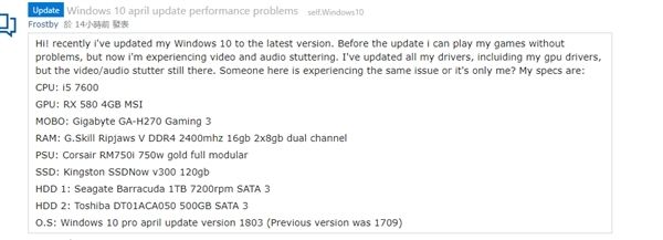 据Softpedia报道,一些 Reddit用户 开帖讨论成,升级v1803后, 游戏帧数出现了下滑。比如《上古卷轴:天际特别版》,升级前的帧数是57~60FPS,升级后摸上45都很难。