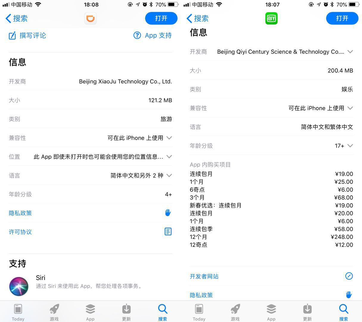 滴滴、爱奇艺的 App Store 详情页