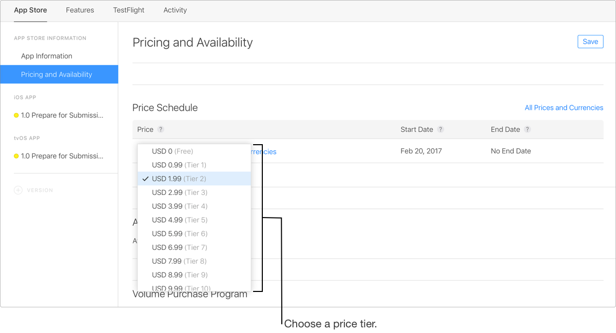 值得一提的是,开发者并不能随意决定 app 以及 App 内购买项目的价格,为了提升开发者的输入效率、减少出错率,苹果为付费项目设置了许多个价格档位,开发者可以根据需求,自行选择最合适的档位。