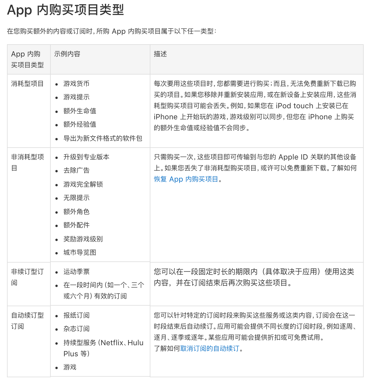 具体的 App 内购买项目包括以下类型: