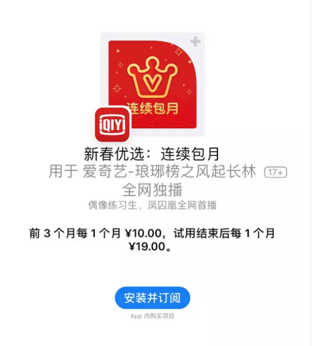 不过,爱奇艺在 iOS 平台也有过定价较低的时候。2018 年春节期间,爱奇艺在 App Store 开启了「新春优选」的连续包月优惠活动,前三个月会员半价。