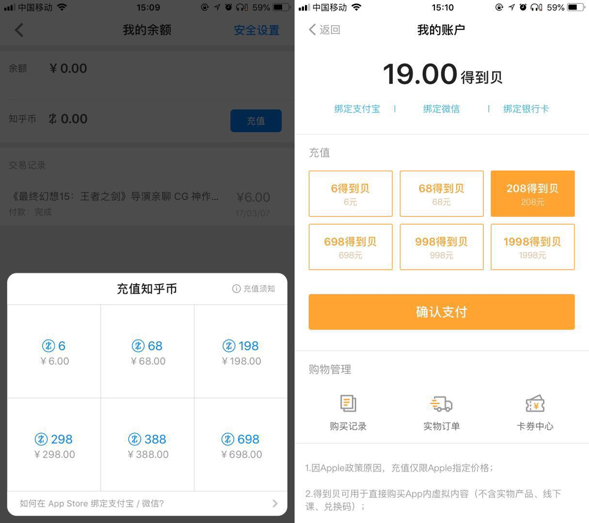 此外,知乎、得到等 app 的 iOS 版则采用了充值知乎币、得到贝的方式,由于 App Store 的定价策略,只能提供不同的充值档位,但这两种虚拟货币与人民币等值,不同平台充值并不存在价格差异,只是充值方式有所不同。