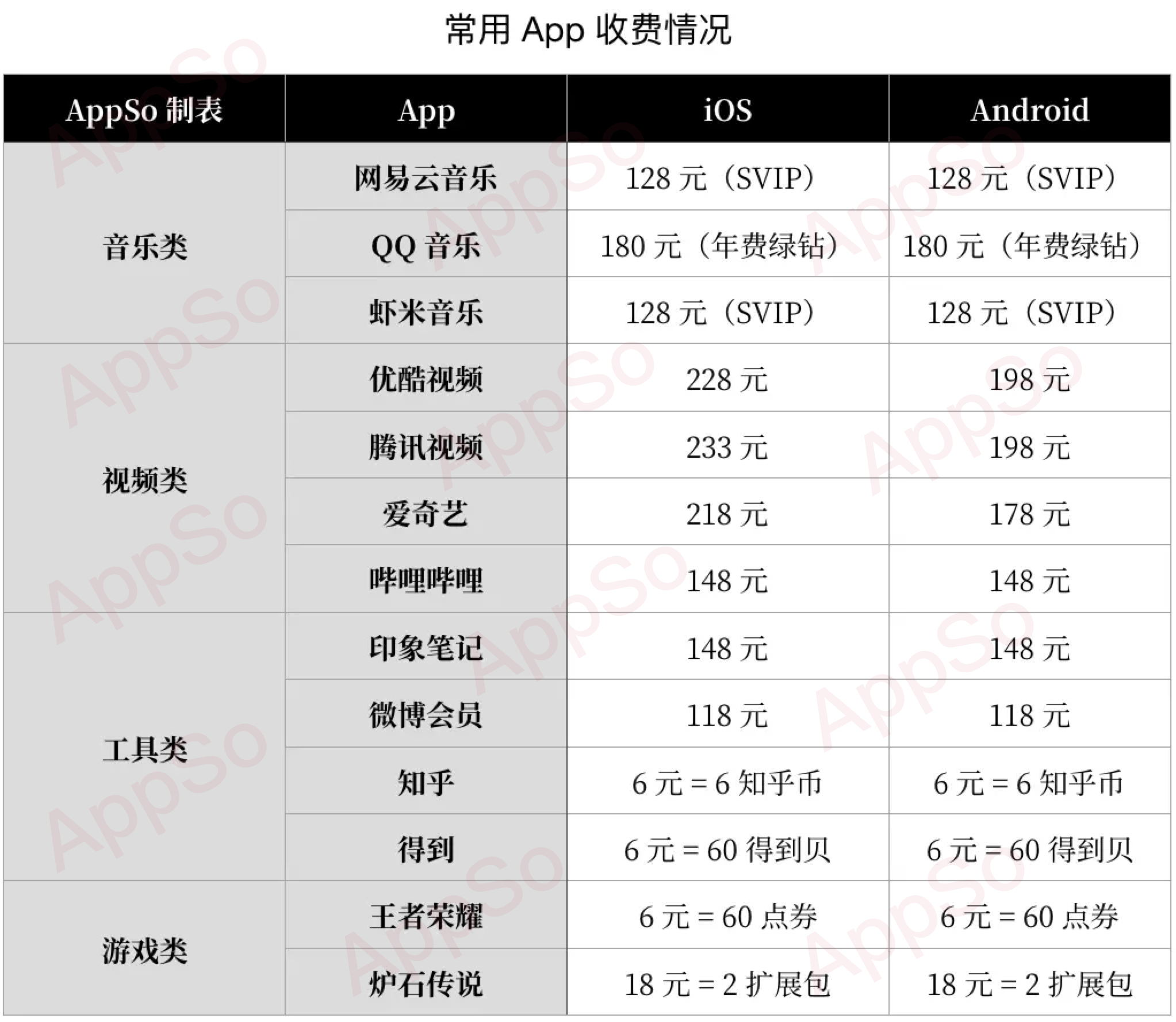 AppSo(微信公众号:AppSo)统计了一些常见的 App Android / iOS 平台的内购买项目,发现这些 App 内购买项目的定价都是一致的。