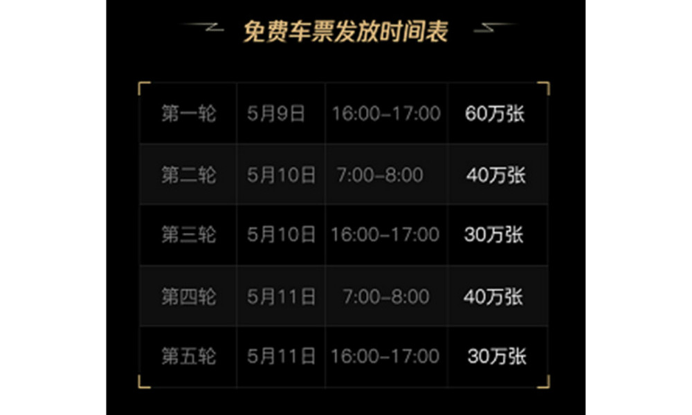 5 月 9 日开始,连续 3 天,5 轮抢票,有两百万张乘车码免费送。