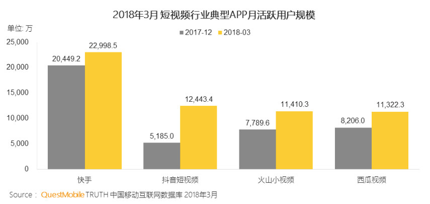 如果单看用户量级,抖音截至 2018 年 3 月 1.24 亿左右的月活(MAU)距离业界老大快手还有一定距离,但将近 140% 的环比涨幅,以及来自头条系的另两路纵队——火山小视频、西瓜视频的合力夹击,已然让张一鸣有了更多底气。