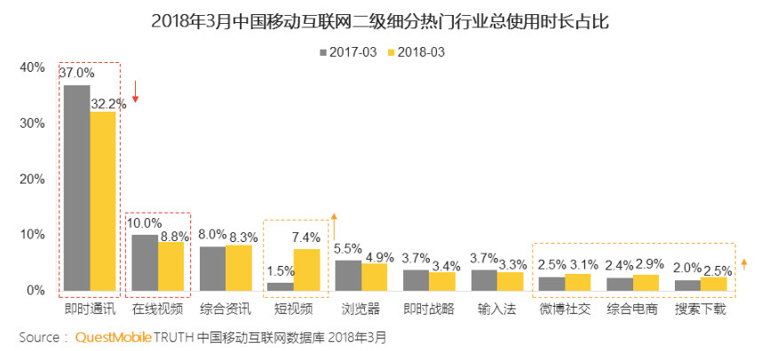 根据市场研究机构 QuestMobile 的最新报告,2018 年第一季度,中国移动互联网用户使用时长排名前五位的细分行业分别为:即时通讯、在线视频、综合资讯、短视频和浏览器。