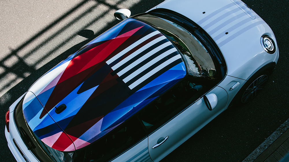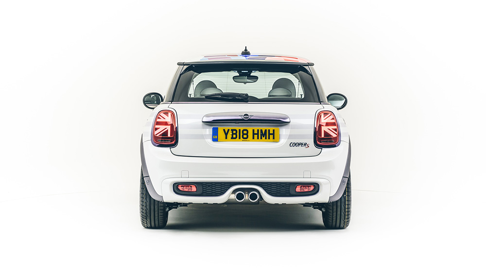 皇室婚礼限量版 Mini Cooper 的涂装抽象化地融入了很多英国国旗和婚礼相关的图案,引擎盖和后轮翼子板上方的浅灰色条纹就像是通往婚姻殿堂的步道,给纯白色的车身多了一些点缀。由于梅根·马克尔是美国演员,所以婚礼限量版 Mini Cooper 的车顶没有直接印上英国国旗,而是结合了英美两国国旗的抽象化图案,多了一点时尚气息。据称车顶的贴花是 Mini 设计师纯手工打造的。