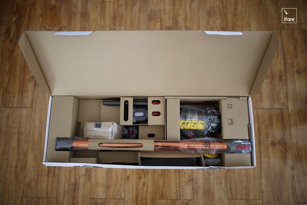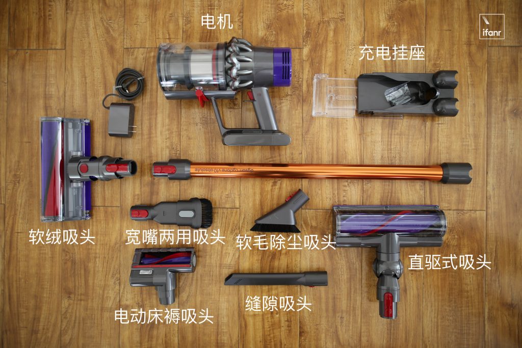 V10 的包装盒内布局非常紧凑,四大件六小件全都整齐地容纳在了这个纸箱里。爱范儿拿到的是搭配软绒/直驱式双吸头的 V10 Absolute 版本,配件如下图: