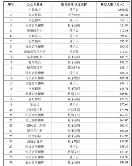 在交易预案中显示,量子云运营的微信公众号共981个,涵盖了情感、生活、时尚、亲子、文化、旅游等诸多领域,粉丝数量合计超过2.4亿。