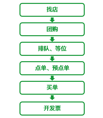 一次到店堂食大概可以拆分为这几个环节:找店——团购——排队等位——点单、预点单——买单——开发票。