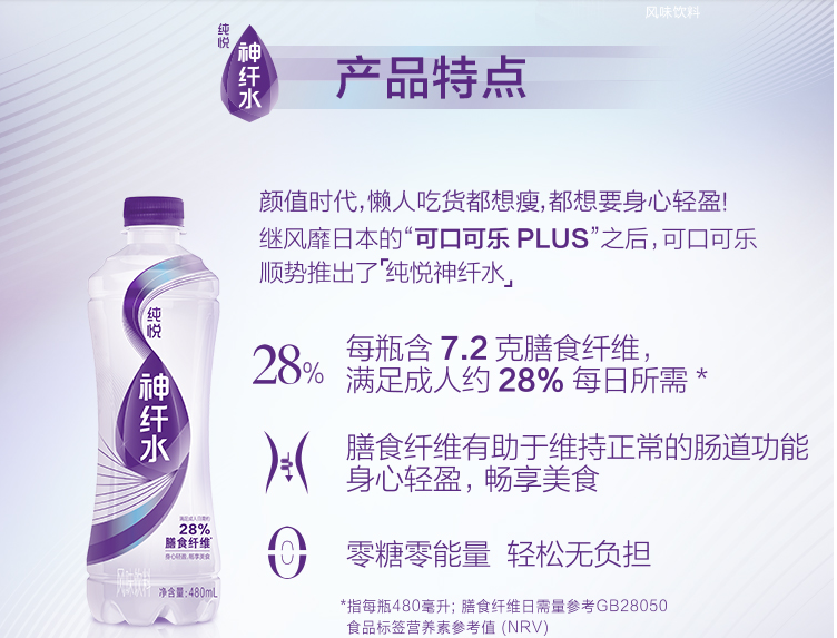 可口可乐更新了旗下品牌纯悦的包装和 logo,推出添加了膳食纤维的新品“纯悦神纤水”,还邀请了彭于晏担任代言人。
