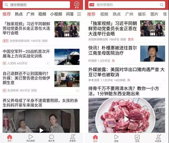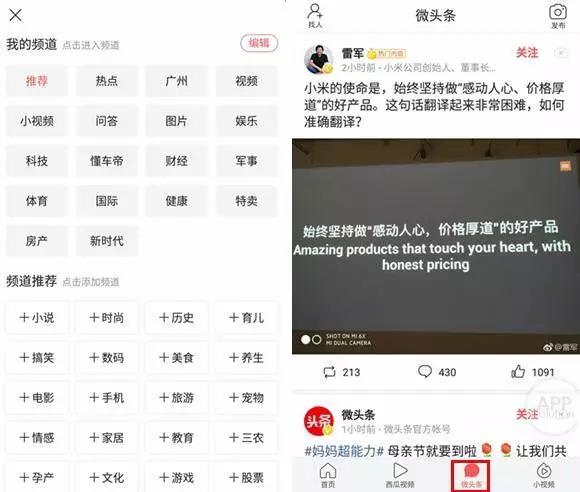 我们可以看出,界面整体风格和设计无异。差别在于《今日头条》可选的频道更多,并且有一个微头条的栏目。