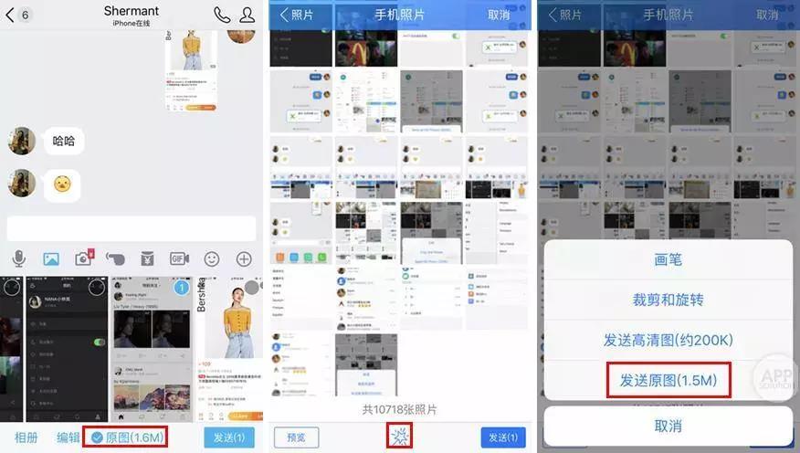 正式版的 QQ 在相册里直接选中图片,就会出现「发送原图」的选项(下图左一);而国际版则需要点击下方的仙女棒,接着点击「发送原图」即可(下图左二三)。