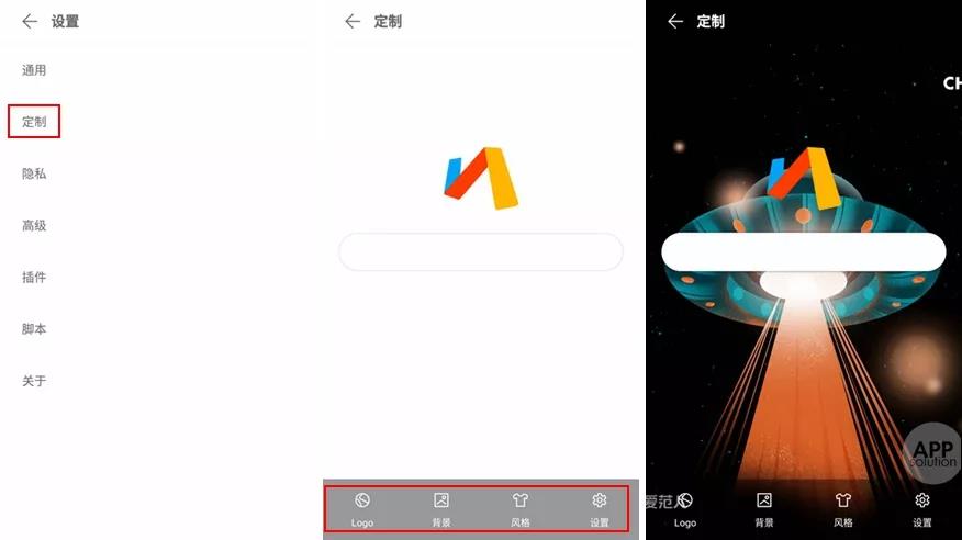 令人惊喜的是,via 还可以自行定制搜索主页。主页的 Logo、背景、风格还有透明度等,都由你来设计。