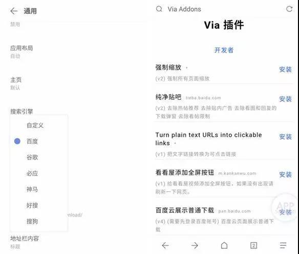 via 不仅可以选择搜索引擎,还可以添加其他的插件,比如纯净版贴吧。