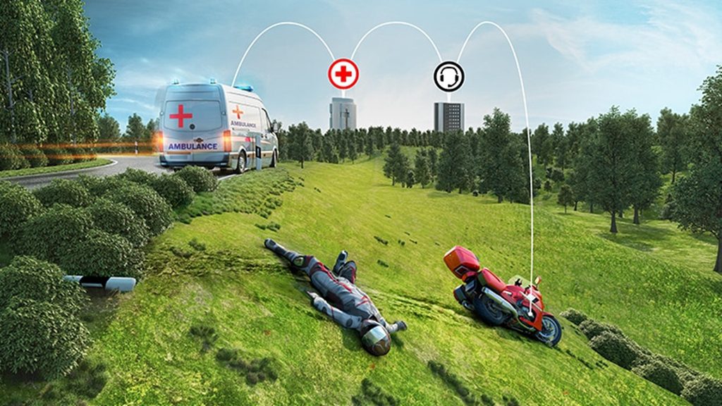 万一,我说的是万一,驾驶摩托车不幸遇到车祸的话,这套系统也会在判断事故发生之后主动呼叫距离事故现场最近的急救中心。